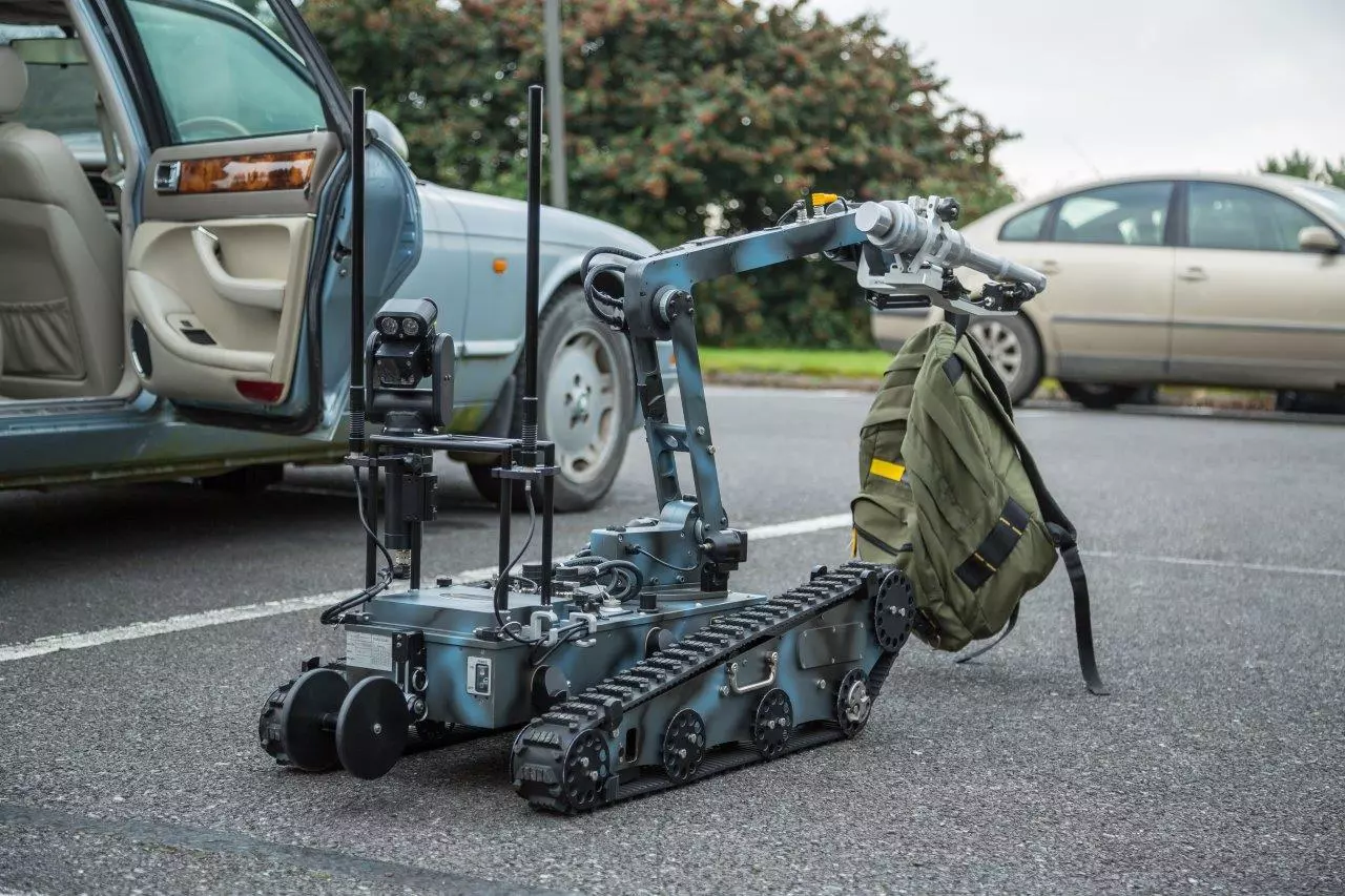 Description Riddler is an advanced, reliable and robust explosive ordnance disposal robot with applications extending to security, CBRN, and X-ray. Riddler’s manipulator arm has five degrees of freedom [DOF] which are driven by electric actuators. It has a remotely operated fail-safe firing system. Features Long range operation via the Command Console [up to 1 km non-line-of-sight] Compatible with wide range of Disruptor's Operating time: up to 8 hrs [mission dependent] Pigstick and Hotrod Disruptor Firing without ejecting Disruptor Fail-safe firing circuit 6 colour cameras as standard and 2 auxiliary camera ports 5 Independent spotlights Multiple MESH radio options All joints are protected by clutches in case of crash or fall Front tracks have dampening system to protect them from crash or falls Tool Changing Gripper with power and data port Rear sliding Tool-bay with power and data port Large capacity rear battery drawer can take up to 6 x BB2590 Robot, including motors, etc. is IP65 certified